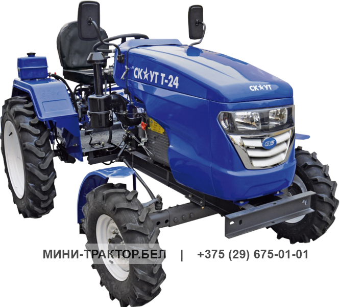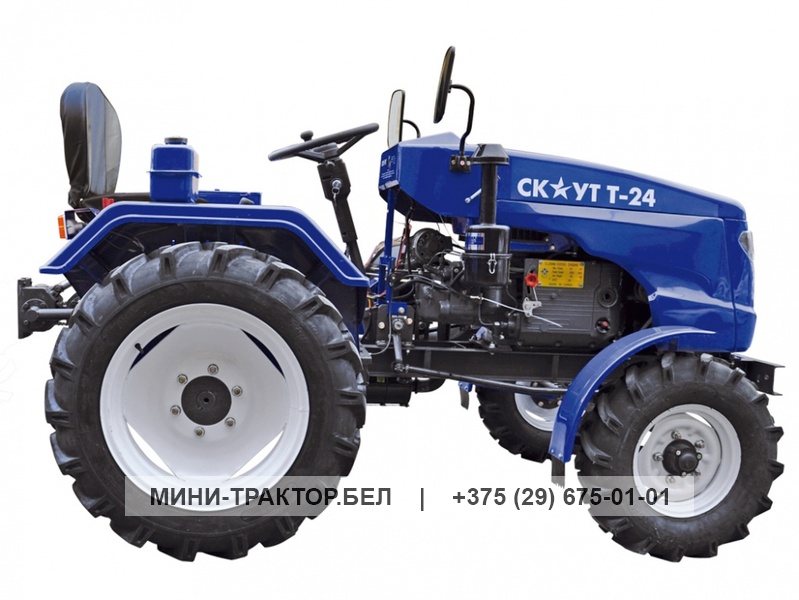 В стандартную поставку трактора Скаут T-24 входит активная почвофреза для обработки и культивации любого типа почвы, а так же двухкорпусный регулируемый плуг. Почвофреза приводится в действие при помощи шестеренчатого редуктора с цепным приводом. Трактор может агрегатироваться как с однокорпусными, так и с двухкорпусными плугами различных конструкций. Ширина культивации 120 см.